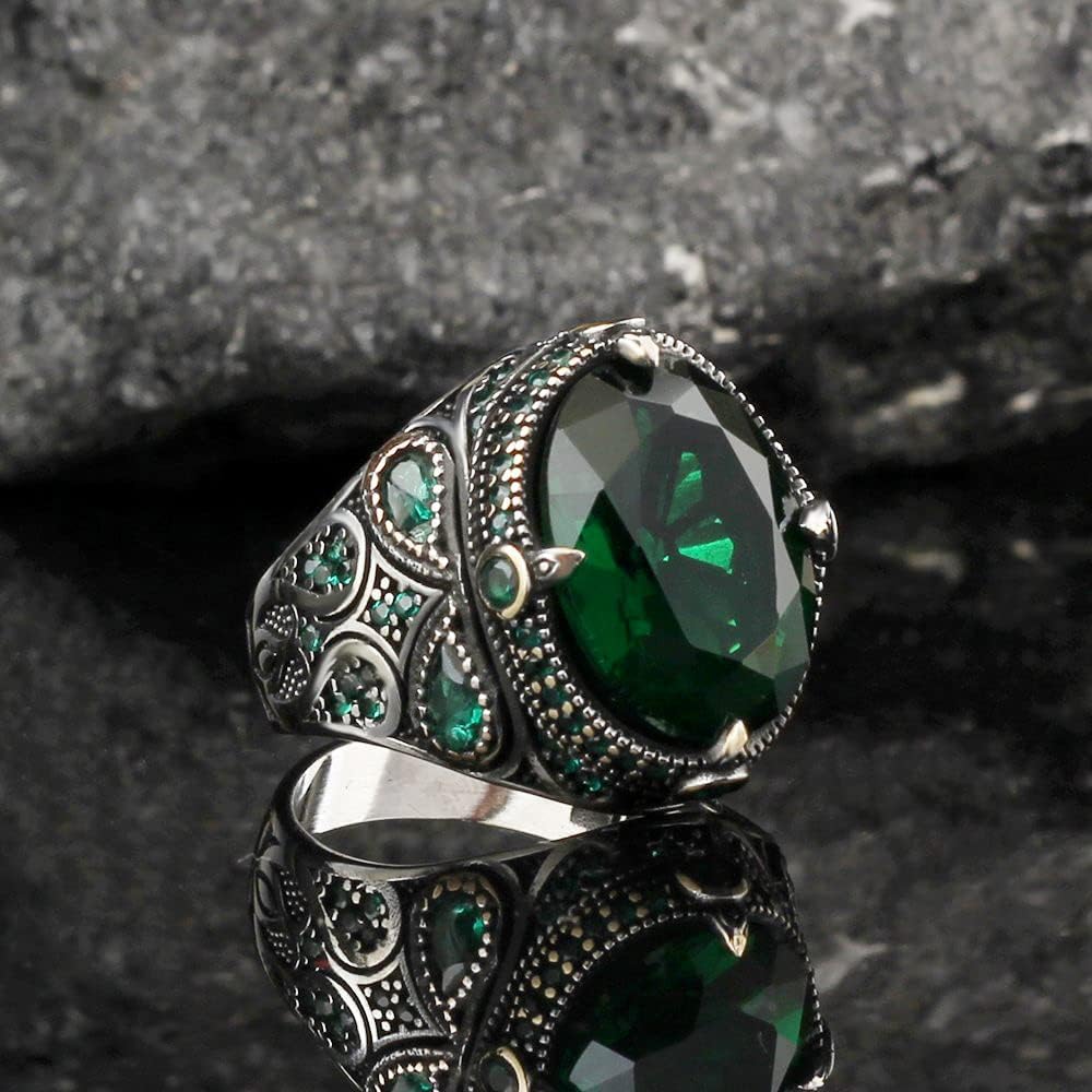 El Yapımı 925 Ayar Gümüş Erkek Yüzük, Yeşil Zirkon Taşı, Şık Bant Tasarımı, Zarif Erkek Takısı