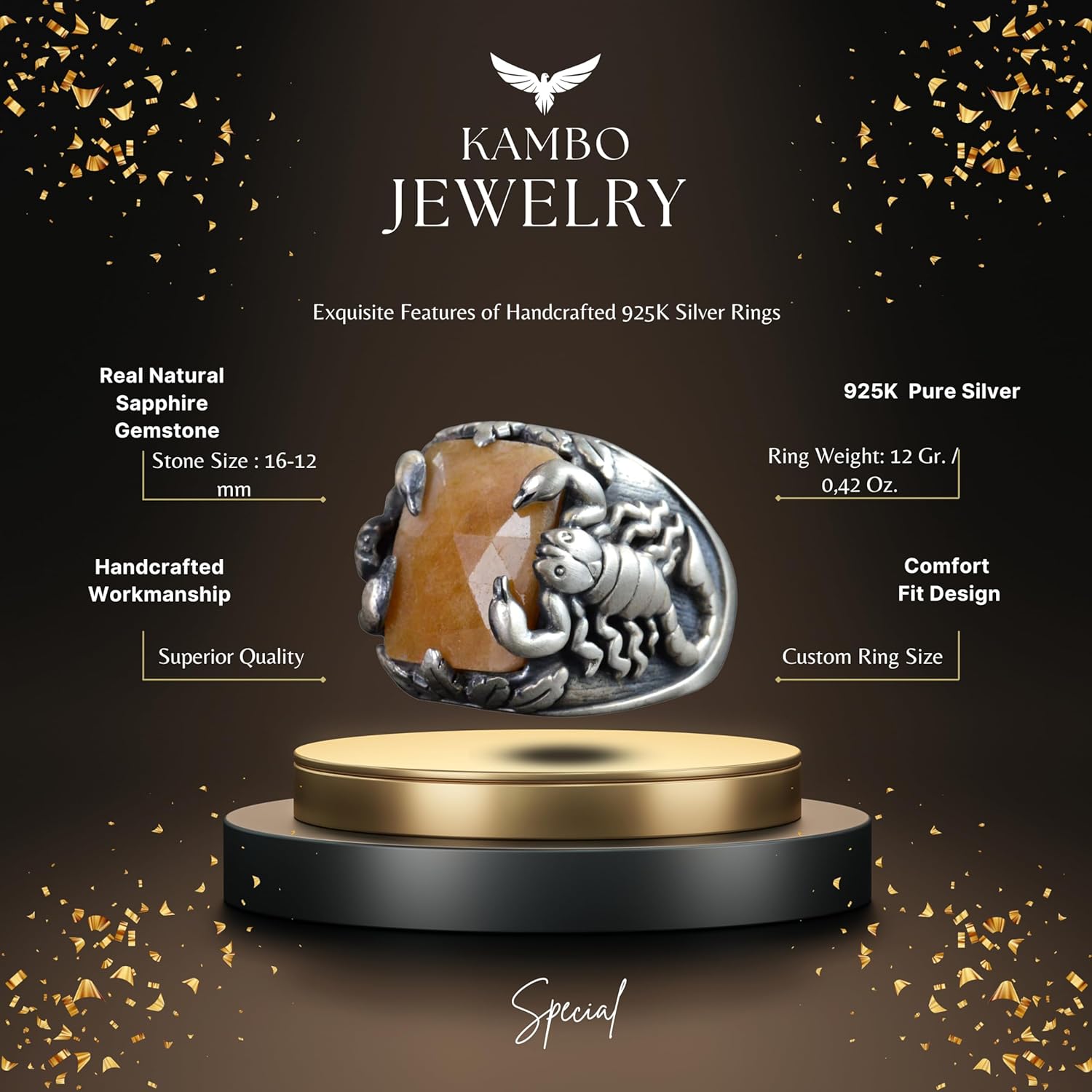 El Yapımı 925 Ayar Gümüş Yüzük, Gerçek Doğal Sarı Safir Taşı ve Akrep Tasarımı - Erkekler İçin Takı