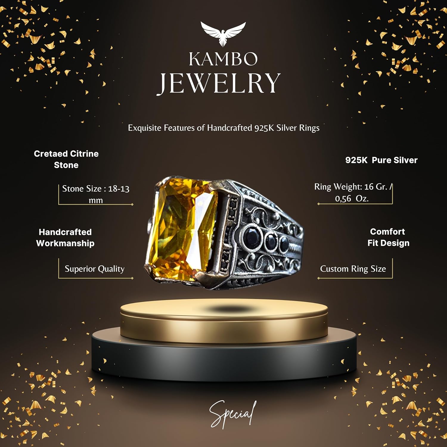 El Yapımı Citrin Taşlı Yüzük, 925 Ayar Gümüş Erkek Yüzüğü