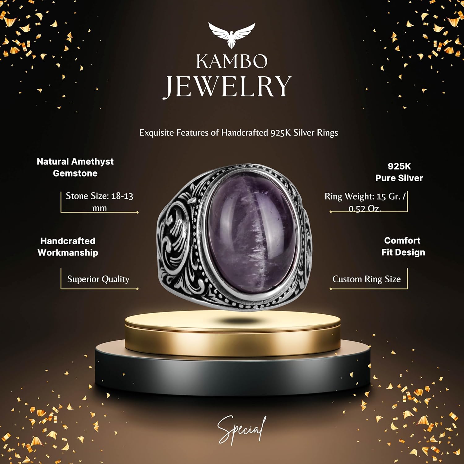 El Yapımı Doğal Ametist Taşlı Yüzük - 925K Katı Gümüş Erkek Yüzüğü - Sezgi ve Koruma Tasarımı