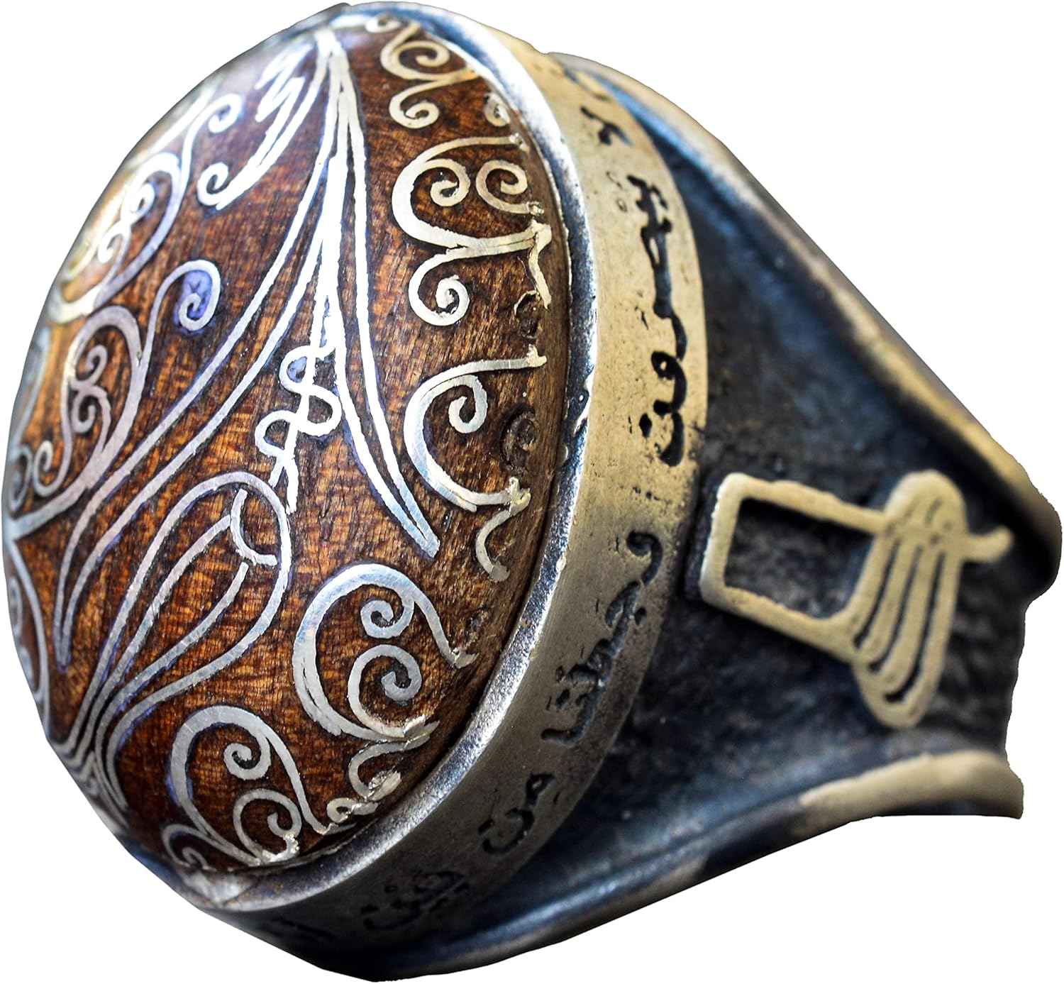 El Yapımı Ceviz Oymalı Gümüş Erkek Yüzük, İnci Oyması ve Süslemesi ile