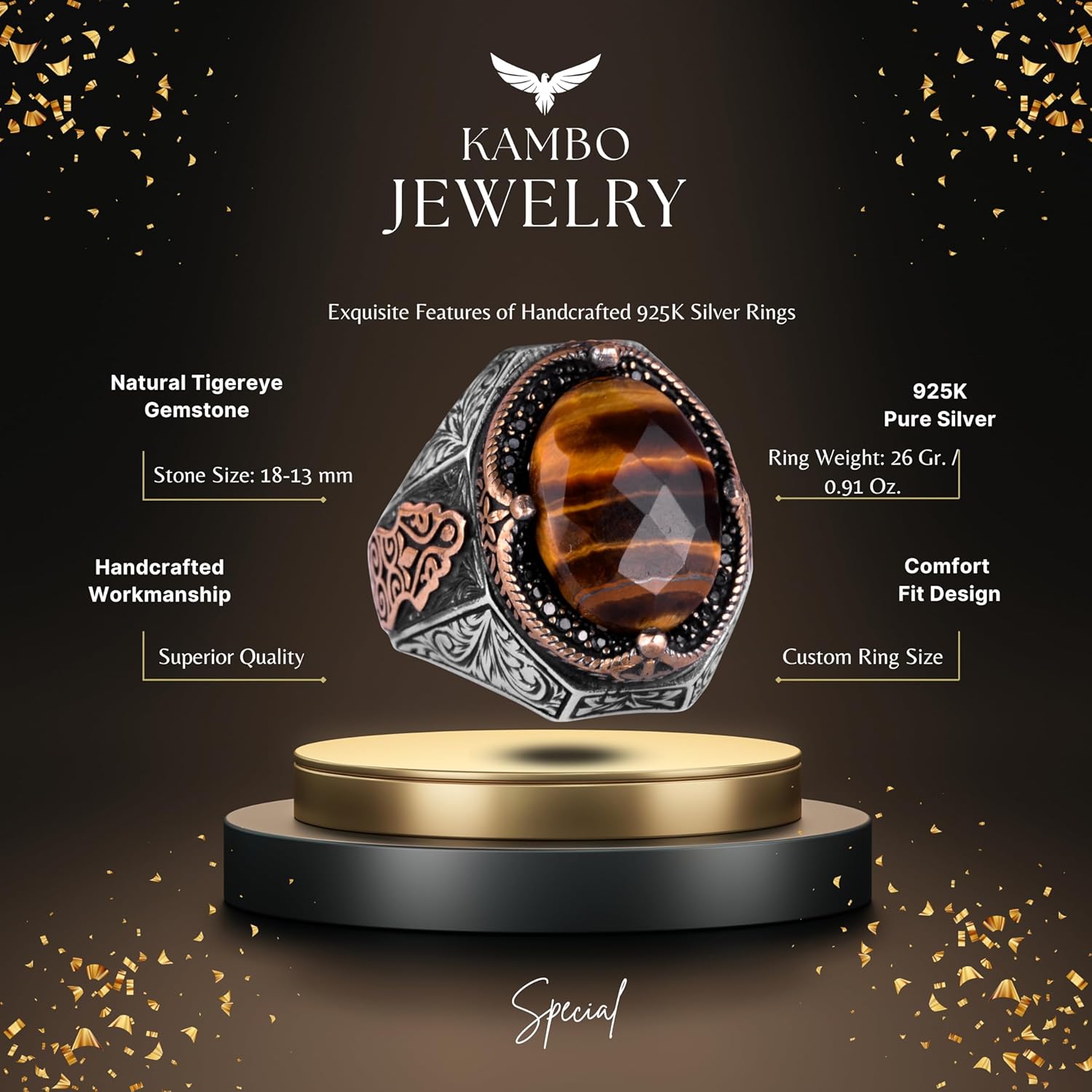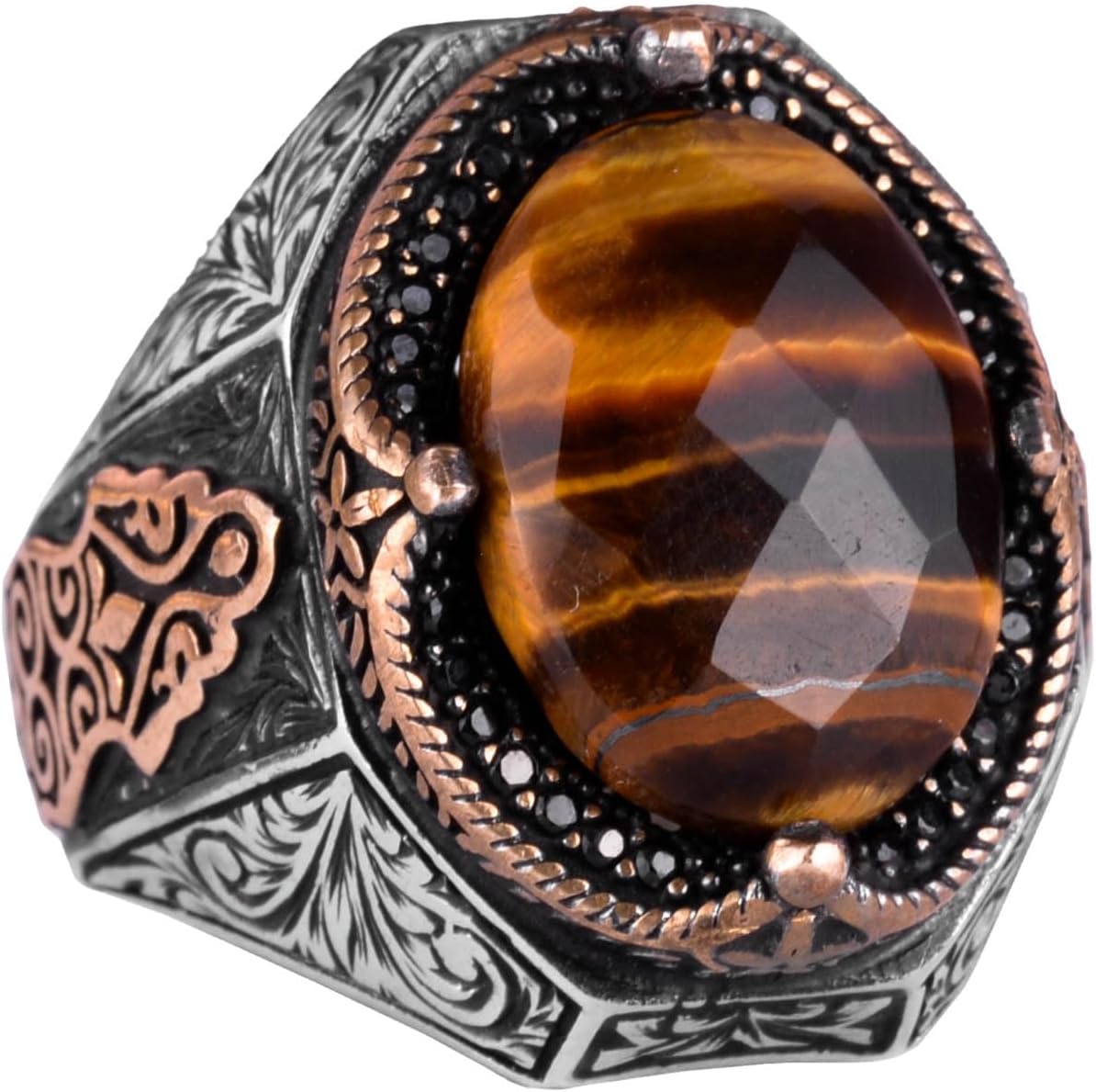 El Yapımı Doğal Kaplan Gözlü Taş Yüzük - 925 Ayar Katı Gümüş Erkek Yüzüğü, Cesur Tasarım