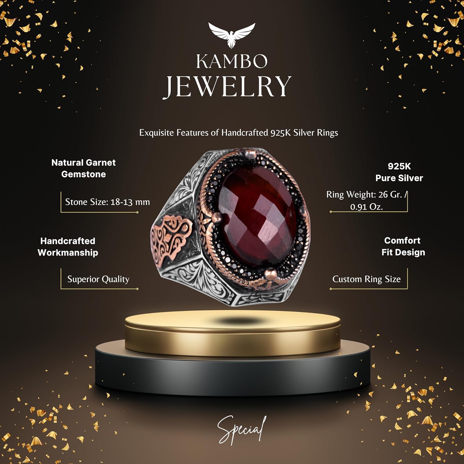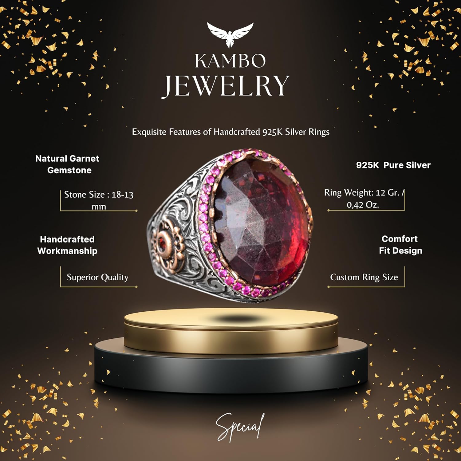 El Yapımı Doğal Garnet Taşlı Yüzük, Sterlin Gümüş Erkek Yüzüğü - Tutku ve Koruma Sembolü