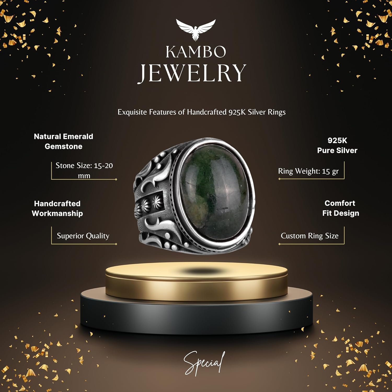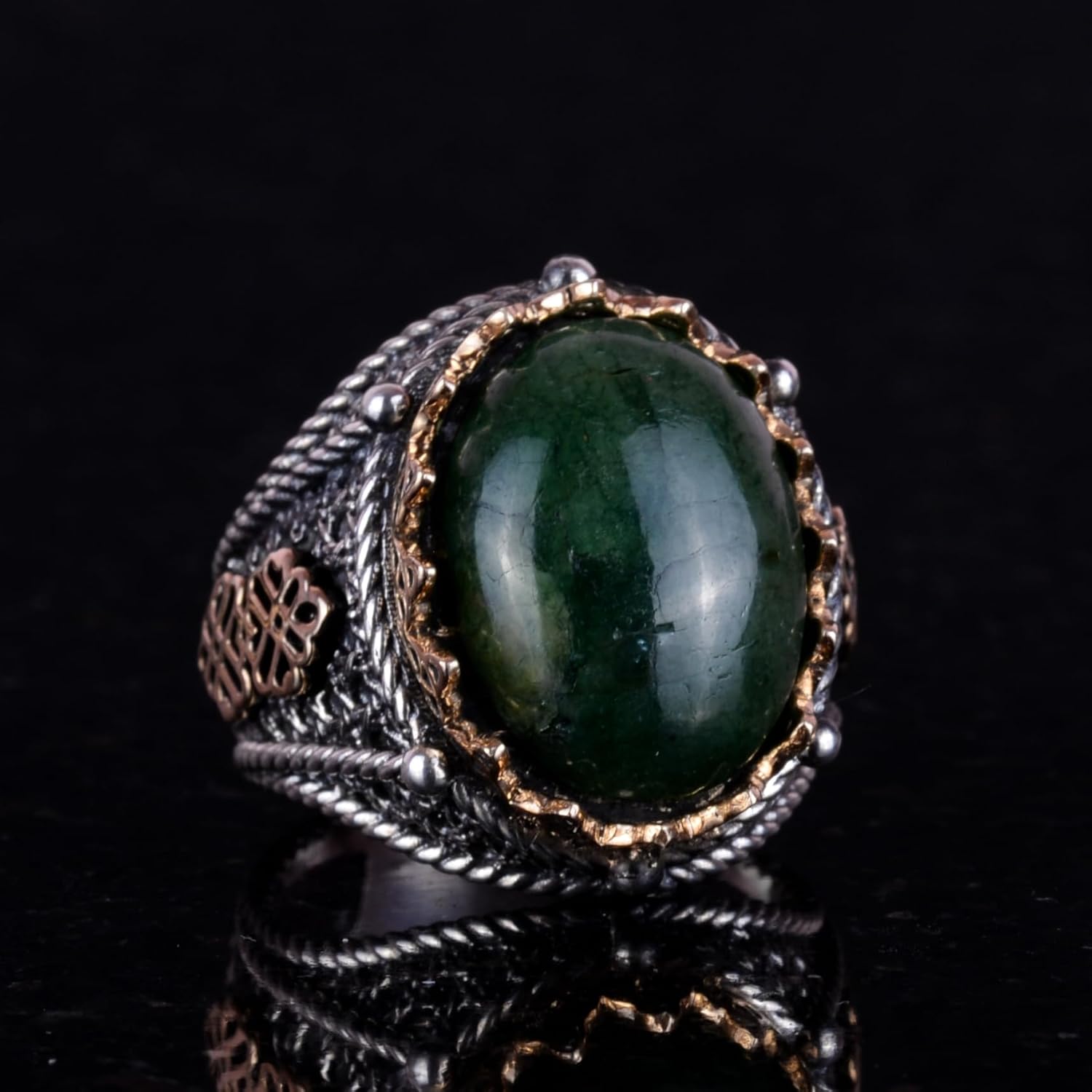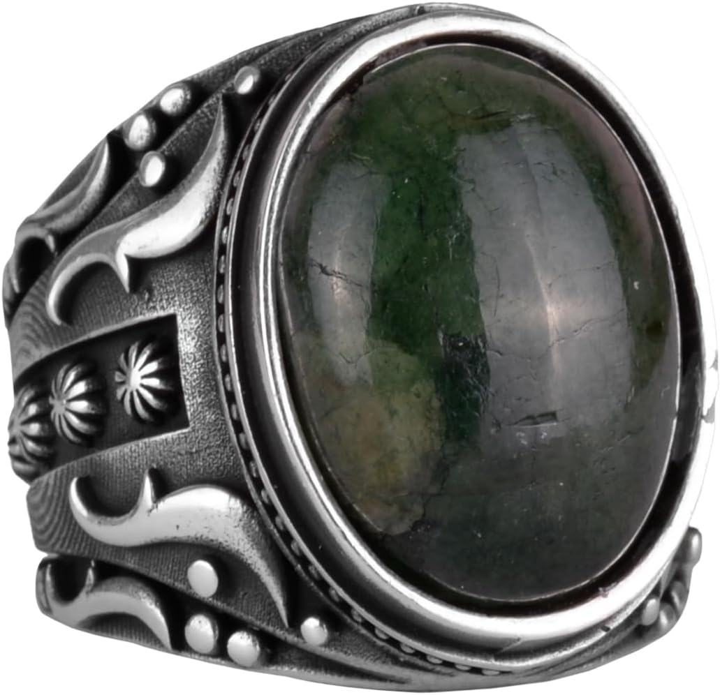 El Yapımı Doğal Cabochon Zümrüt Taşlı Yüzük, 925K Saf Gümüş Erkek Yüzüğü, Tasarım Gümüş Erkek Yüzüğü