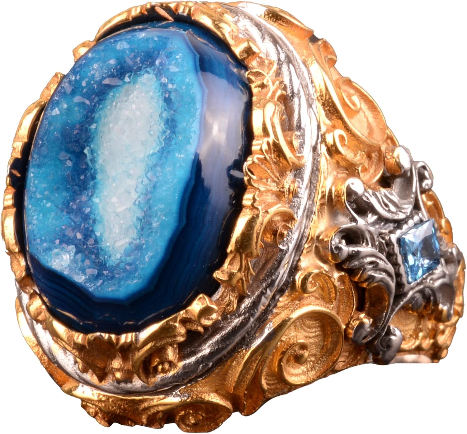Doğal Druzy Kuvars ile Gümüş Doğum Taşı Yüzüğü - Gümüş Erkek Büyük Yüzük