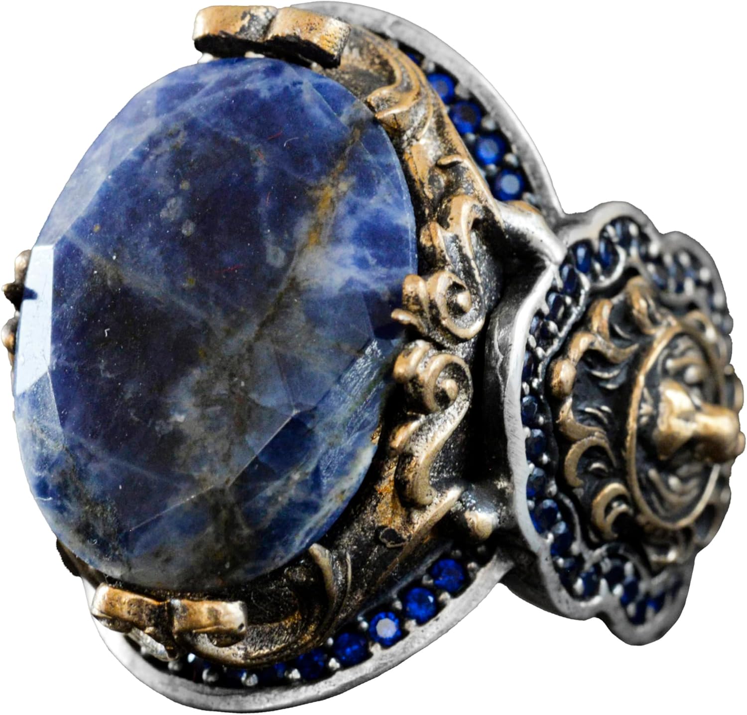 Gerçek Doğal Sodalit Taş Yüzük, Hayvan Yüzüğü, Aslan Yüzüğü, 925 Ayar Gümüş Büyük Yüzük