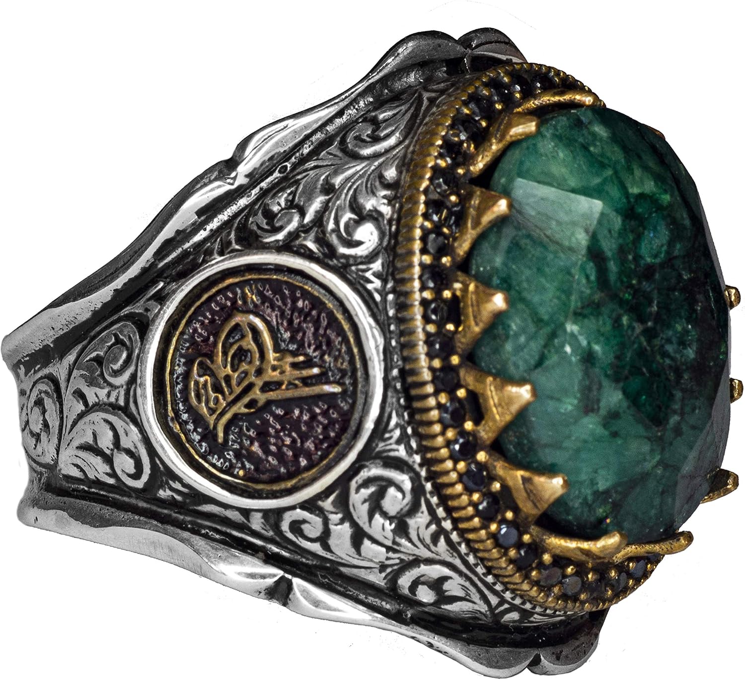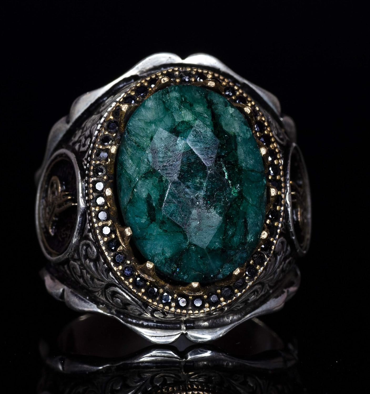 Osmanlı Tugralı Doğal Zümrüt Taşlı Gümüş Yüzük