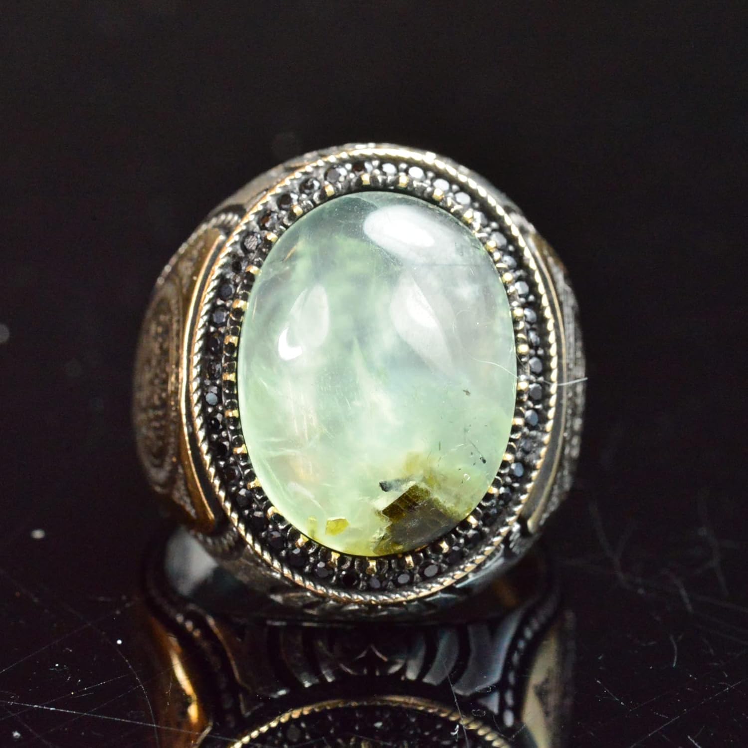 Gerçek Doğal Jade Prehnite Taş Yüzük, 16.95 Karat, 925 Ayar Gümüş Yüzük, Taş Gümüş Yüzük