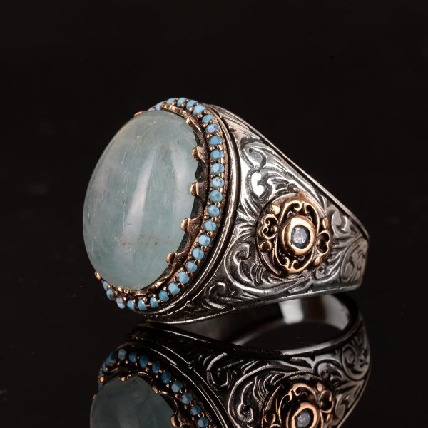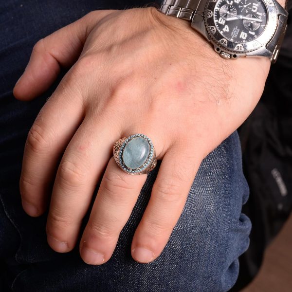 925 Ayar Gümüş Doğal Akuamarin Taşlı Erkek Yüzük – El Yapımı Kral Takı