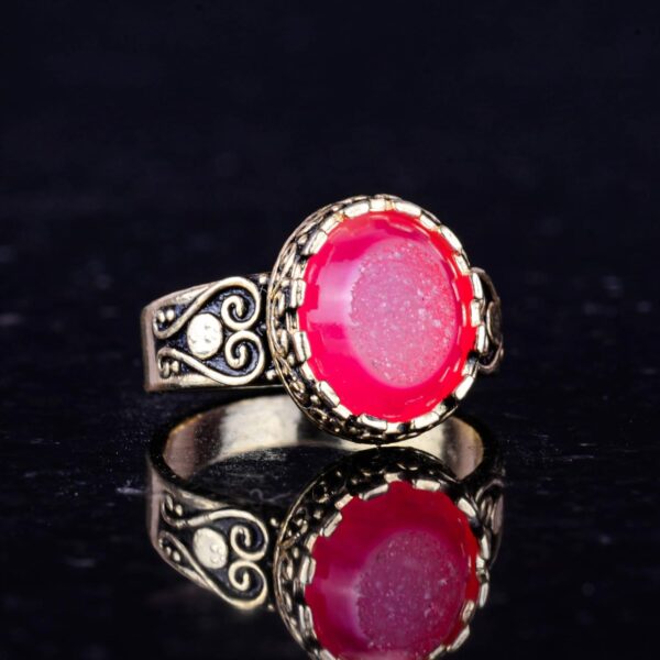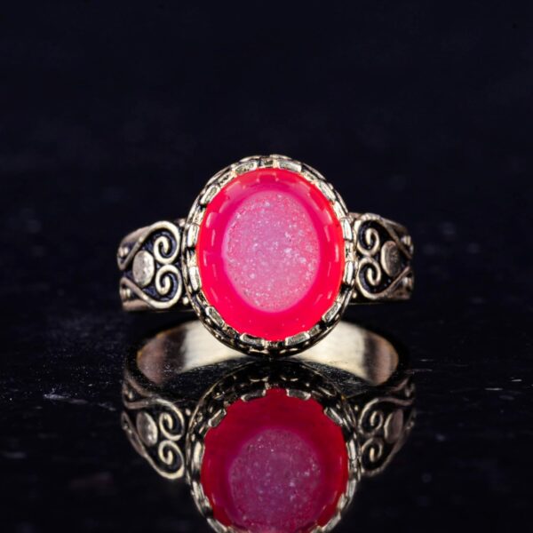 Bu altın kaplama 925 ayar gümüş yüzük, gerçek doğal druzy taş ile birlikte doğanın ham güzelliğini altının zarafeti ile harmanlıyor. Parlak yüzeyi ve benzersiz dokusu ile tanınan druzy taşı, bu vintage esintili ifade yüzüğüne doğal bir cazibe katıyor. İnce işçilikten hoşlananlar için mükemmel olan bu yüzük, lüks finisajı ve ayırt edici tasarımıyla ön plana çıkıyor.