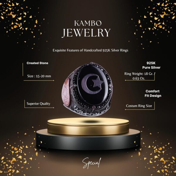 Bu muhteşem el yapımı yüzük, 925K gümüşte yer alan ikonik yıldız ve hilal tasarımı ile özenle ve hassasiyetle hazırlanmıştır. Eşsiz tasarımı ve kaliteli malzemeleri, her türlü etkinlik için mükemmel bir aksesuar olmasını sağlar.
