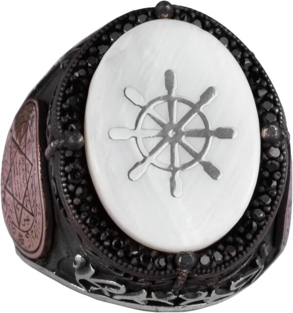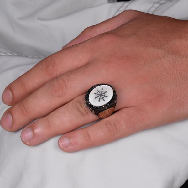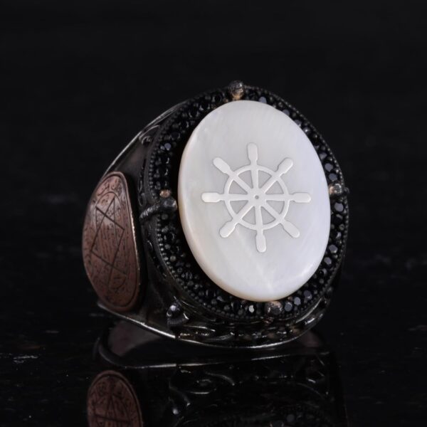 Bu yüzüğün merkezinde yer alan gemi tekerleği, rehberlik, yön ve kontrolün güçlü bir sembolüdür. Hayatı amaç ve kararlılıkla yönlendirenler için bu tasarım derin bir anlam taşır ve bu nitelikleri değerli bulan herkes için anlamlı bir seçim yapar.