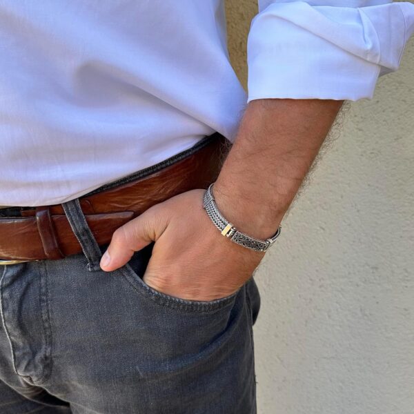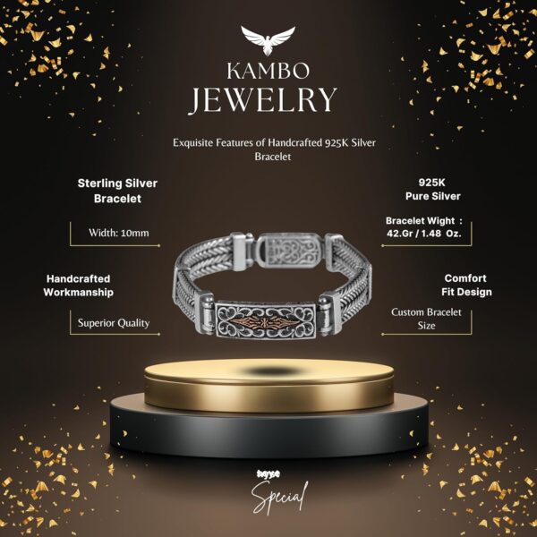 Bu 925 ayar gümüş erkek bilekliği, dayanıklılığı zarafetle birleştiren bir ustalık eseridir. Bilekliğin, her kıyafete eşsiz ve sofistike bir dokunuş katan titizlikle el işçiliği ile yapılmış karmaşık bir tasarımı vardır. Yüksek kaliteli 925 ayar gümüşten üretilmiş olması, uzun ömürlü kullanım ve zamansız bir parlaklık sağlar, bu da onu takı koleksiyonunuza mükemmel bir katkı haline getirir.
