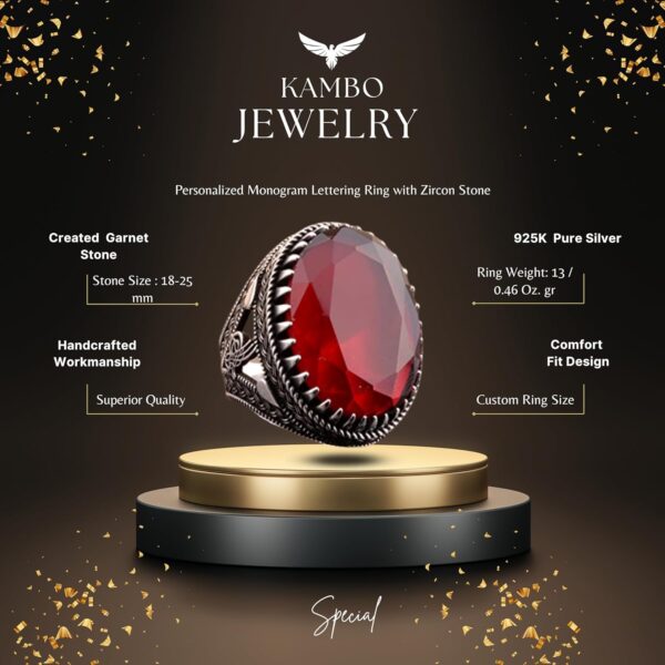 Bu görkemli erkek yüzüğü, cesur zarafet ve tarihi sembolizmin mükemmel bir birleşimidir. Yüksek kaliteli 925 ayar gümüşten yapılmış olup, derin kırmızı rengiyle dikkat çeken yapay granat taşı içerir. Ayrıntılı Osmanlı mühür tasarımı, yüzüğe tarihi bir anlam ve sofistike bir dokunuş katar, bu da onu gerçek bir ifade parçası haline getirir.