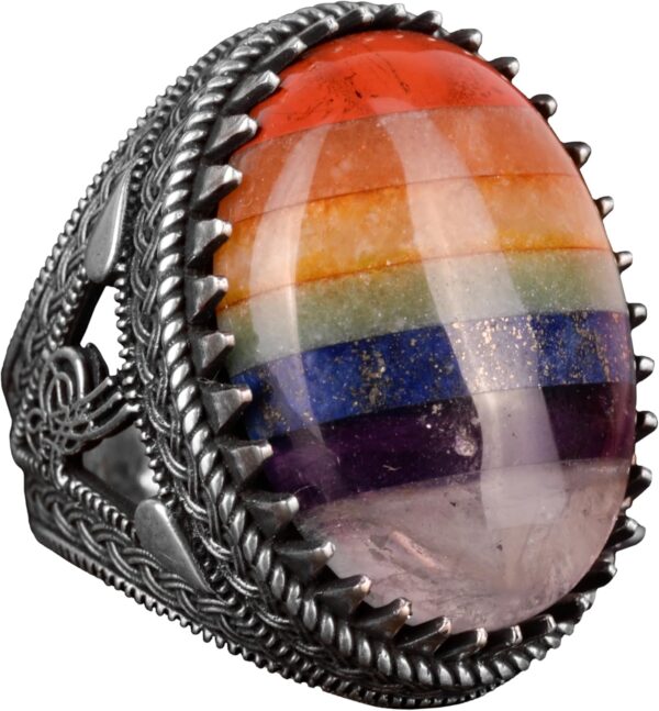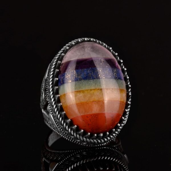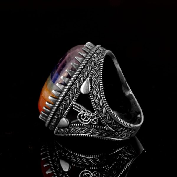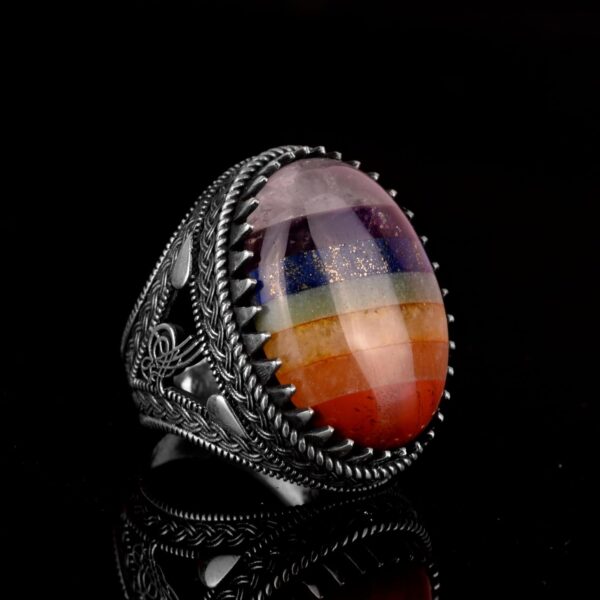 925 Ayar Gümüş Erkek Yüzük, 7 Çakra Doğal Taşı Yüzük, Gökkuşağı Yüzük, Tuğra Yüzük