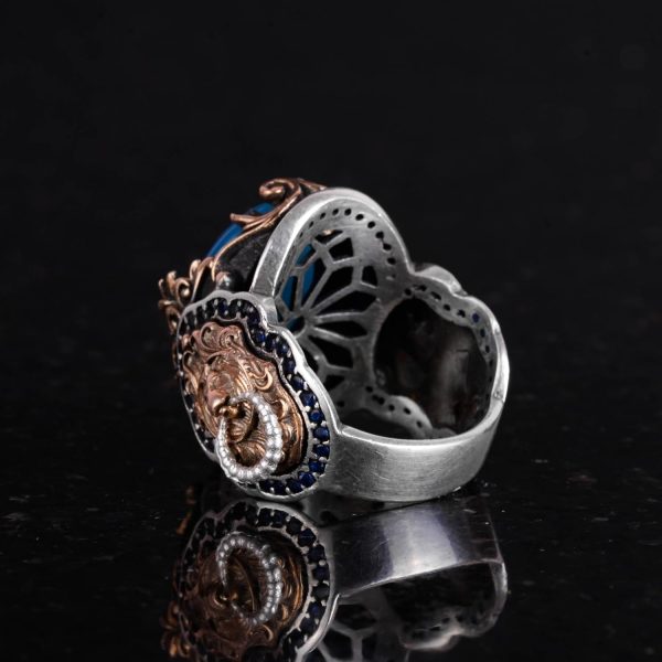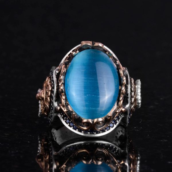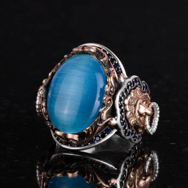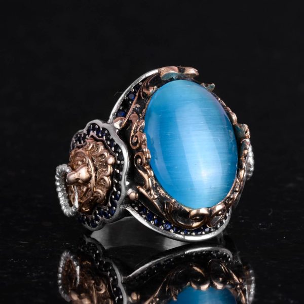 Açık Mavi Kedi Gözlü yapay taş, etkileyici chatoyancy’si ve sakinlik ile netlik ile olan ilişkisi nedeniyle değerli bir taş olarak kabul edilmektedir. Cesaret ve liderliği simgeleyen aslan sembolü ile bir araya geldiğinde, bu yüzük huzur ve güç mükemmel bir harmanını temsil etmektedir.