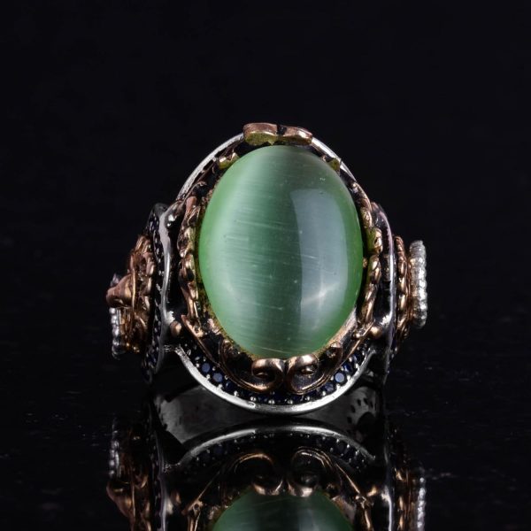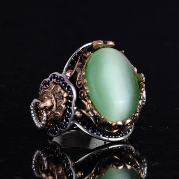 925 Ayar Gümüş Erkek Yüzük – Açık Yeşil Kedi Gözünden Üretilmiş Taş – Aslan Sembolü El Yapımı Yüzük