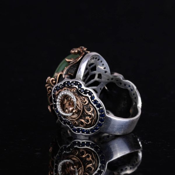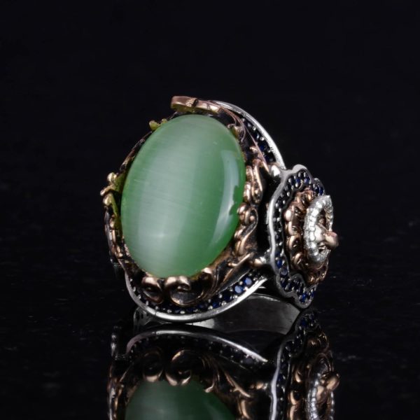 Açık Yeşil Kaplan Gözü taşı, sakinleştirici ve koruyucu özellikleri ile bilinir. Cesaret ve liderliği temsil eden aslan sembolü ile birleştirildiğinde, bu yüzük netlik ve dayanıklılığın güçlü bir temsilini sunar.