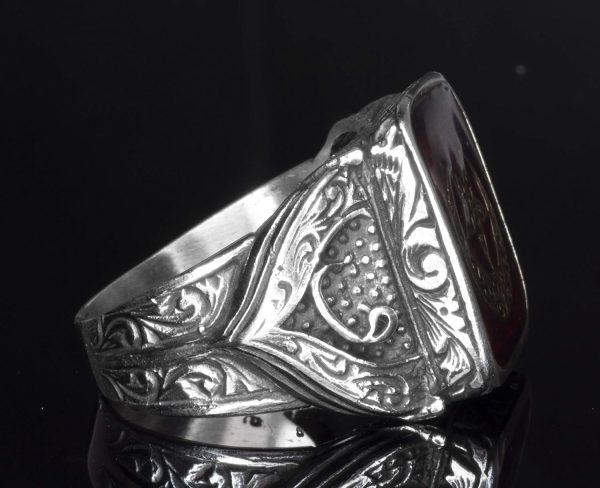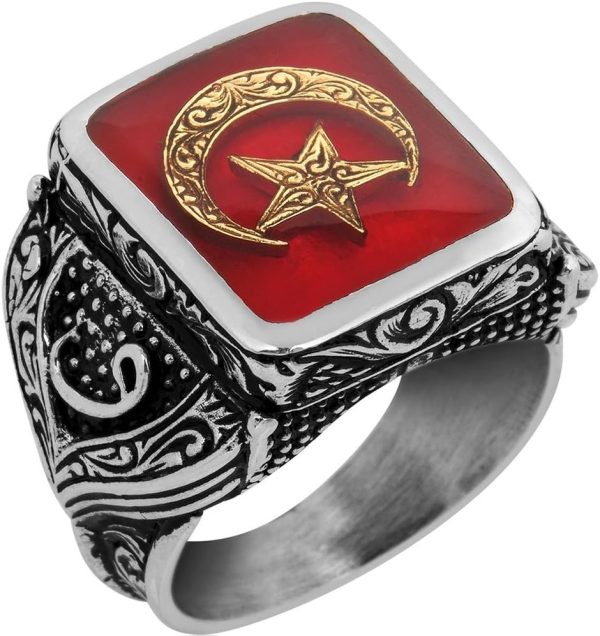 Bu çarpıcı 925 Ayar Gümüş Erkek Yüzüğü ile stilinizi yükseltin. Yüzük, canlı kırmızı bir arka plana karşı yerleştirilmiş cesur bir Ay ve Yıldız tasarımına sahiptir. Güç ve zarafetin sembolleri olan Ay ve Yıldız, güzel bir şekilde işlenmiştir ve bu etkileyici parçaya anlam katmaktadır.