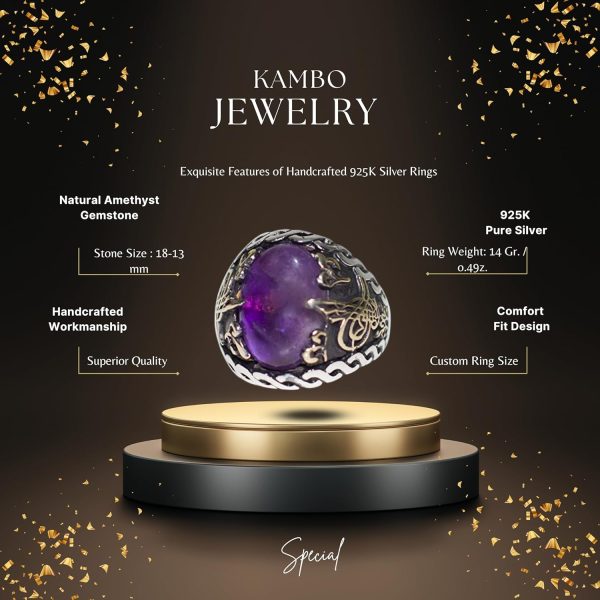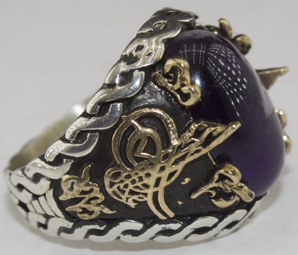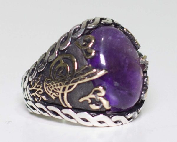 - Yüksek Kalite Malzemeler: 925 Ayar Gümüş’ten yapılmış, muhteşem doğal ametist taşı ve ayrıntılı Osmanlı Tuğra tasarımı ile bezenmiştir.