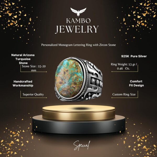 Bu zarif erkek yüzüğü, dayanıklılığı ve lüks parıltıyı garanti eden yüksek kaliteli 925 ayar gümüşten üretilmiştir. Yüzük, el yapımı takılara değer verenler için mükemmel bir parça olan ayrıntılı bir vintage tasarıma sahiptir. Bu yüzüğün merkezinde, canlı renkleri ve benzersiz desenleri ile bilinen doğal Arizona turkuaz taşı yer almaktadır.