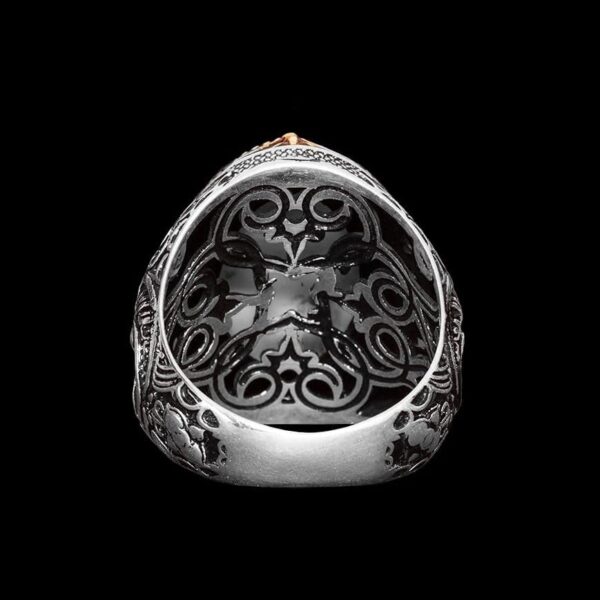 Usta zanaatkarlar tarafından kaliteli 925 ayar gümüşten titizlikle el yapımı olarak üretilmiştir; bu yüzük dayanıklılığı şıklıkla birleştirir. Gümüş bant, gümüş işçiliğinin zengin geleneğini vurgulayan karmaşık desenlerle süslenmiştir ve genel tasarıma bir dokunuş zarafet katmaktadır.