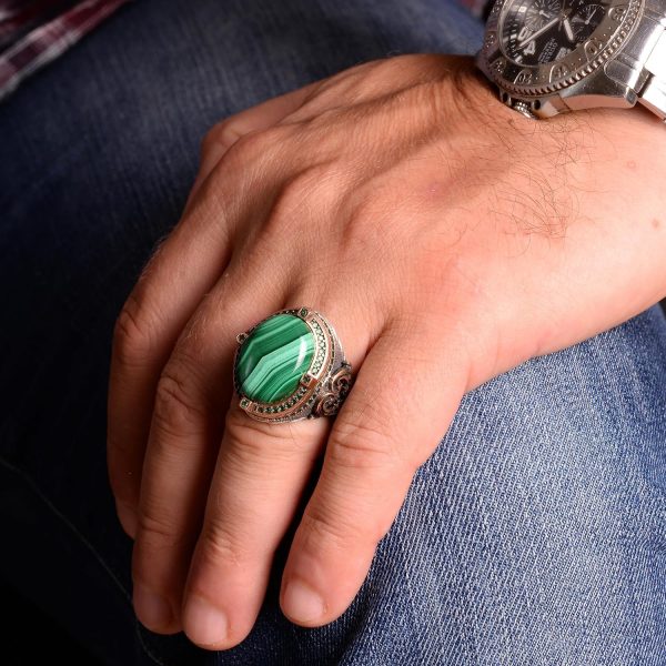 Bu eşsiz erkek yüzük, vintage cazibe ve modern şıklığın mükemmel bir karışımıdır. Premium 925 ayar gümüşten üretilmiş olup, büyüleyici yeşil rengi ve benzersiz bantlama desenleri ile bilinen doğal malakit taşını içermektedir. Vintage esintili tasarımı, klasik bir zarafet dokunuşı ekleyerek bu yüzüğü zamansız bir takı parçası haline getirir.