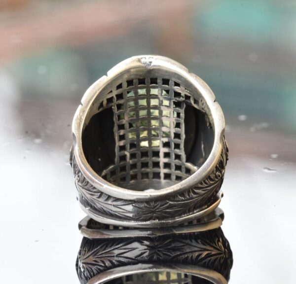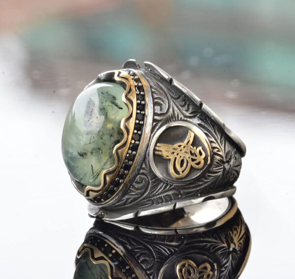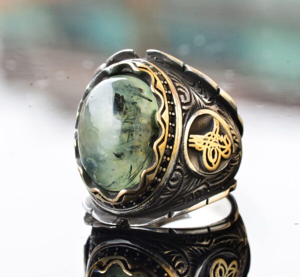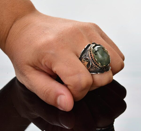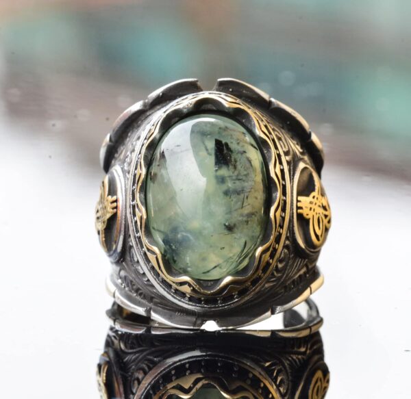 - Yüzüğe benzersiz ve doğal bir dokunuş katan gerçek bir prehnit taşı ile süslenmiştir.