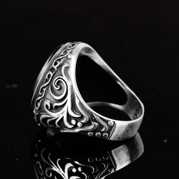 Yüzük, şeridin üzerinde karmaşık bir floral tasarıma sahiptir ve üstün zanaatkarlık ile detaylara gösterilen özeni sergiler. Bu sanatsal dokunuş, yüzüğe sofistike ve zarif bir hava katarak onu erkekler için zamansız bir aksesuar haline getirir.