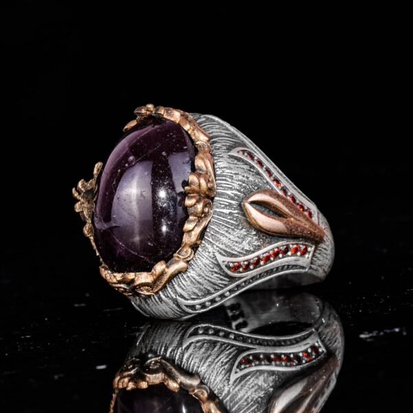 Bu çarpıcı erkek yüzüğü, yüksek kaliteli 925 ayar gümüşten üretilmiştir ve nadir bir doğal yıldız granat taşı ile süslenmiştir. Taşın benzersiz yıldız etkisi, cesur retro ilhamlı tasarıma lüks bir dokunuş katmaktadır.
