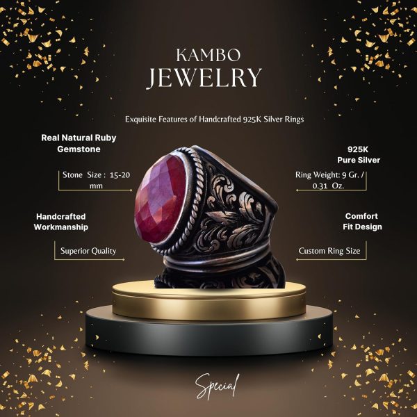 Şaşırtıcı doğal yakut taşı ile süslenmiş 925 ayar gümüş erkek yüzüğümüzün zarafetini deneyimleyin. Bu yüzük, yüksek kaliteli 925 ayar gümüşten titizlikle el yapımıdır; bu da dayanıklılığını ve zamansız çekiciliğini garanti eder. Yakutun derin kırmızı tonu, her kıyafete lüks ve sofistike bir dokunuş katmaktadır.