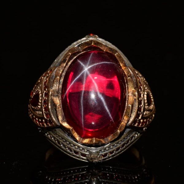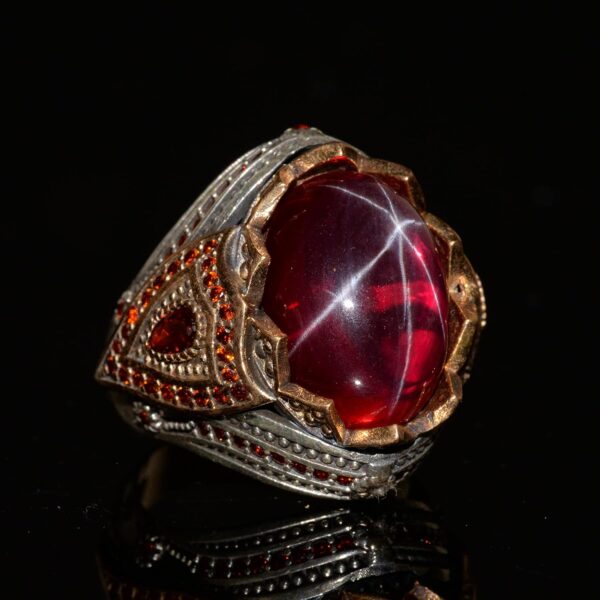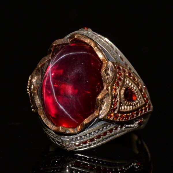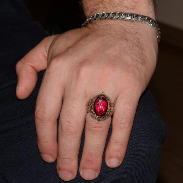 Bu yüzüğün merkezinde, koruyucu ve şifalı özellikleri ile bilinen doğal bir yıldız yakut taşı bulunmaktadır. Yıldız Yakut, sezgiyi, duygusal gücü artırmak ve koruma sağlamakla ilişkilendirilir. Aynı zamanda Yengeç burcu ile bağlantılıdır ve bu burçta doğanlar için özellikle faydalıdır.
