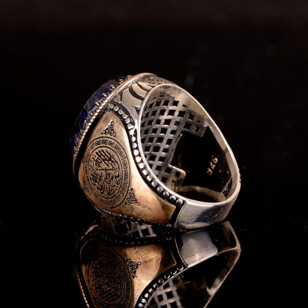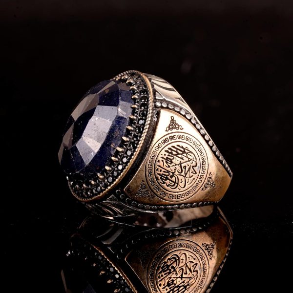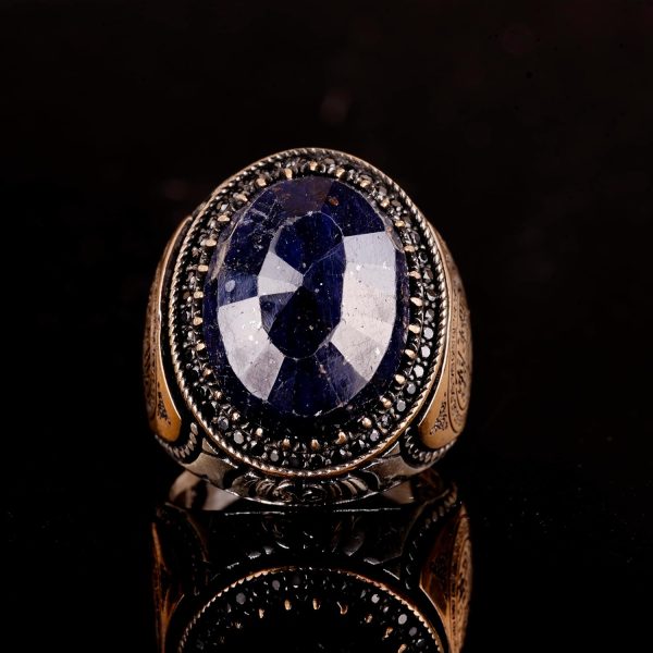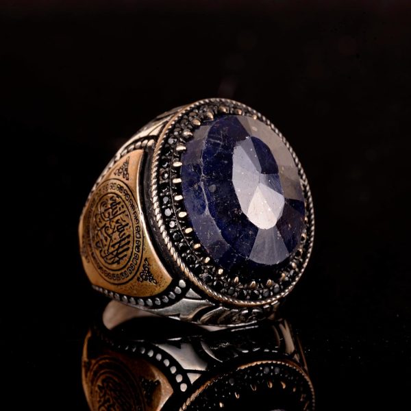 Doğal Safir ve İslami Oymalarla El Yapımı 925 Ayar Gümüş Erkek Yüzük