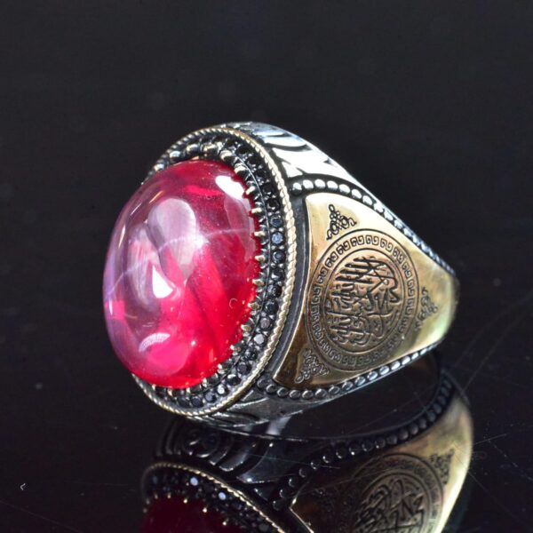 Doğal Yıldız Yakutu ve İslami Oymalarla El Yapımı 925 Ayar Gümüş Erkek Yüzük