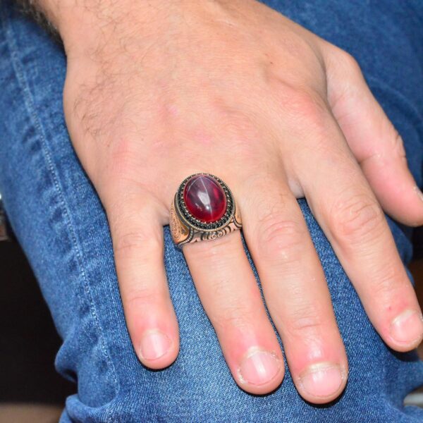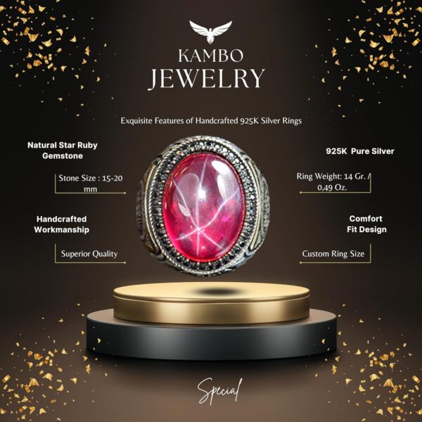 Bu olağanüstü erkek yüzüğü, 925 ayar gümüşün zamansız güzelliğini doğal Yıldız Yakutu’nun güçlü varlığıyla birleştiriyor. Kendine özgü yıldız şeklindeki yansımasıyla bilinen Yıldız Yakutu, güç, tutku ve koruma sembolü olarak değerlendirilen bir taş olup, takılarında güç arayanlar için uygun bir seçimdir.