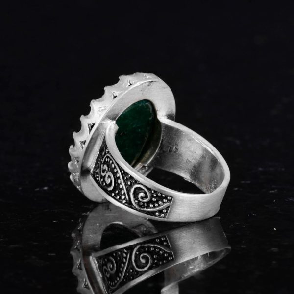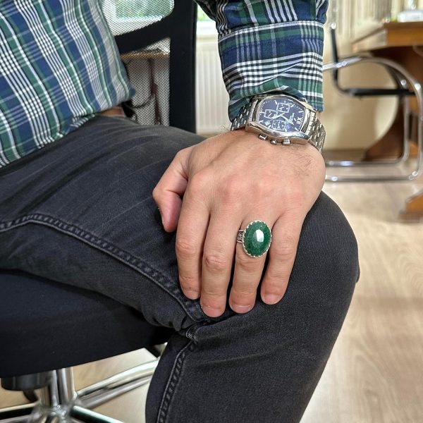 Bu muhteşem erkek yüzüğü, canlı yeşil rengi ve aşk, büyüme ve yeniden doğuş ile olan derin bağlantısı ile ünlü gerçek bir doğal zümrüt taşını sergilemektedir. Yüzük, yüksek kaliteli 925 ayar gümüşten özenle üretilmiş olup, hem dayanıklılık hem de zamanla kararmaya karşı dirençli lüks bir görünüm sunmaktadır.