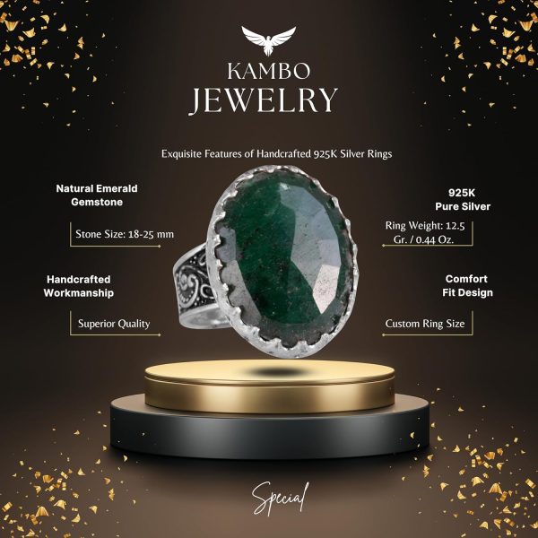 Falcon Jewelry 925 Ayar Gümüş Erkek Yüzüğü, Gerçek Doğal Zümrüt Taşı Yüzüğü