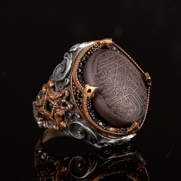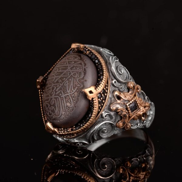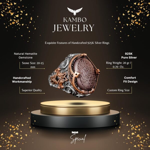 Bu şık erkek yüzüğü, vintage cazibeyi modern şıklıkla kusursuz bir şekilde harmanlıyor. Premium 925 ayar gümüşten yapılan bu yüzük, topraklama ve koruma özellikleri ile tanınan muhteşem bir hematit taşını sergiliyor. Güzelce oyulmuş Arapça hat ile süslenmiş karmaşık vintage İslami tasarımı, bu yüzüğü gerçek bir sanat eseri haline getiriyor.