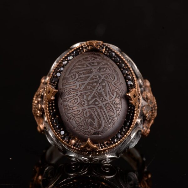 - Hematit taşında karmaşık detaylara sahip vintage İslami tasarım ve oyma Arapça hat ile donatılmıştır.