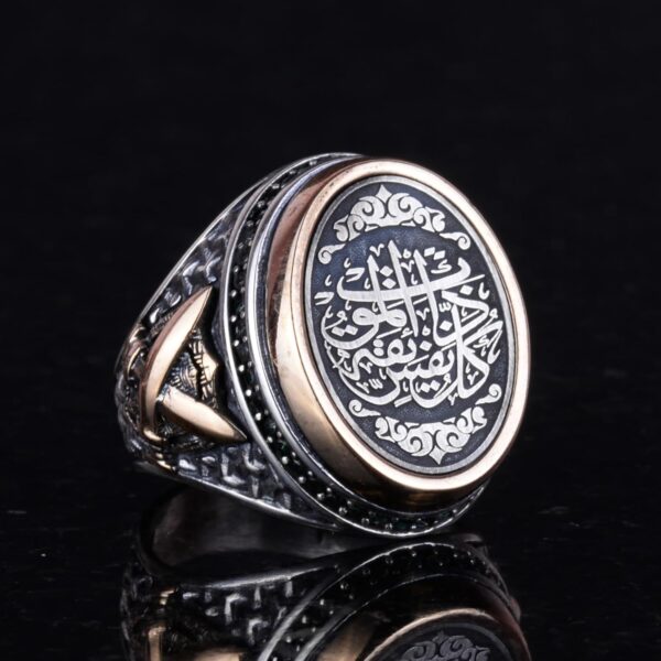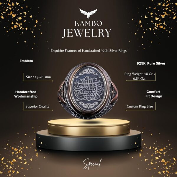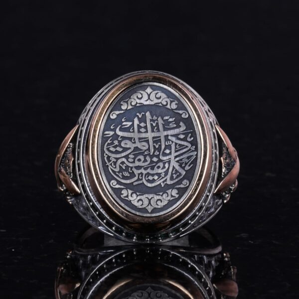 Bu güzel tasarıma sahip yüzük, derin ruhsal anlam taşıyan bir İslami oyma içerir. İnanç ve bağlılığın hatırlatıcısı olarak, takı koleksiyonunuza anlamlı bir katkı sağlar. Günlük olarak veya özel günlerde takılsın, bu yüzük her zaman inançlarınızı ve değerlerinizi yansıtacaktır.