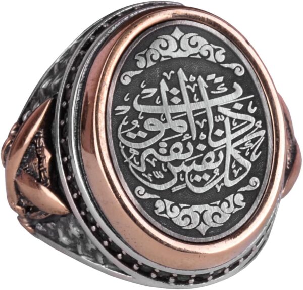 Tarzınızı, premium 925 ayar gümüş üzerine işlenmiş karmaşık bir İslami oyma ile özenle el yapımı yüzüğümüzle yükseltin. Bu yüzük yalnızca bir aksesuar değil, aynı zamanda zarafet ve ruhsal anlamın bir ifadesidir. Gümüş ve bakırın kombinasyonu, her kıyafet için mükemmel bir parça haline getiren benzersiz bir dokunuş ekler.