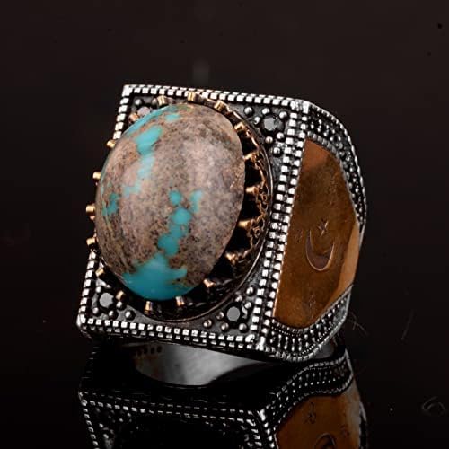 925 Ayar Gümüş Erkek Yüzük, Kare Tasarım ve Doğal Turkuaz Taşı, El Yapımı Gümüş Yüzük