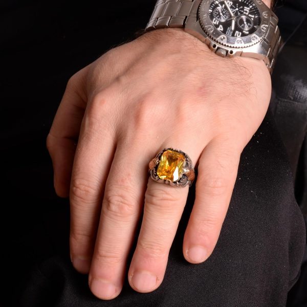 Bu erkek yüzük, zarif ve sofistike bir tasarıma sahip olan premium 925 ayar gümüşten üretilmiştir. Yüzük, canlı bir yapay sitrin taşı veya benzersiz bir yapay sultanit taşı ile seçiminize sunulmuştur; böylece tarzınıza en uygun seçeneği belirleyebilirsiniz.