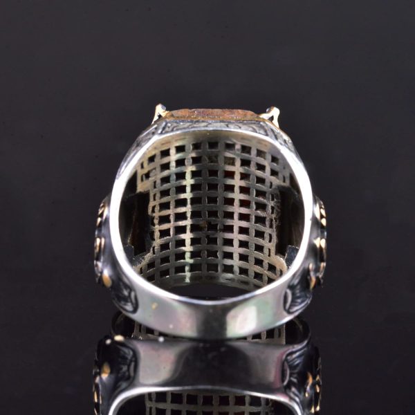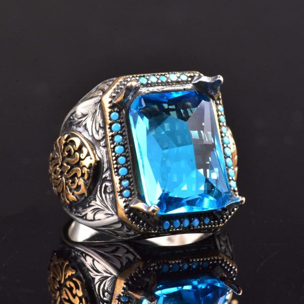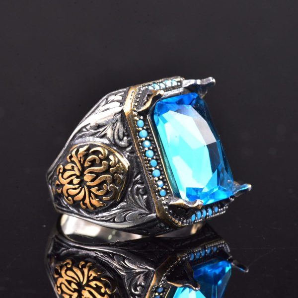 Oluşturulmuş Akuamarin Taşlı 925 Ayar Gümüş Erkek Yüzük ve Karmaşık Oymalı Tasarım