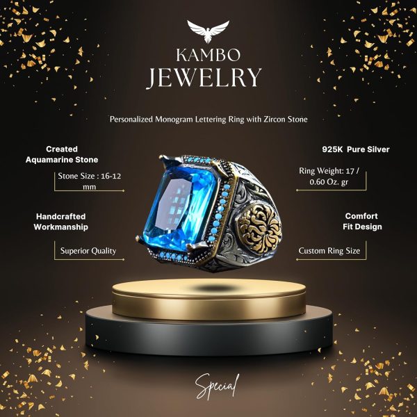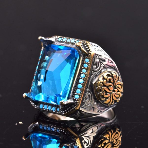 Bu göz alıcı erkek yüzük, cesur zarafet ve sofistikeliğin mükemmel bir birleşimidir. Yüksek kaliteli 925 ayar gümüşten üretilmiştir ve muhteşem mavi rengiyle büyüleyen oluşturulmuş akuamarin taşı ile süslenmiştir. Karmaşık oymalı tasarım, bu yüzüğe gerçek bir ifade parçası olma özelliği kazandıran bir işçilik dokunuşu ekler.