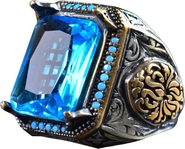 925 Ayar Gümüş Erkek Yüzük, Yapay Akuamarin Taşı ve Karmaşık Oymalı Tasarım ile
