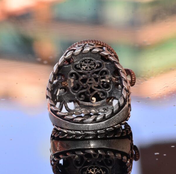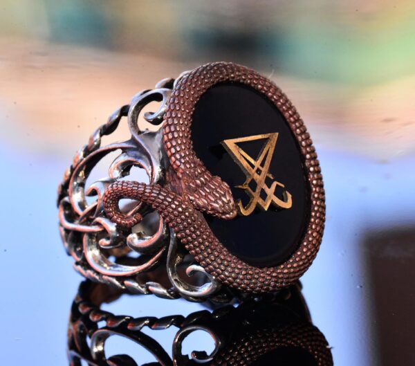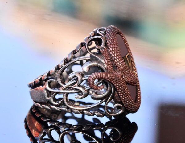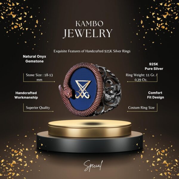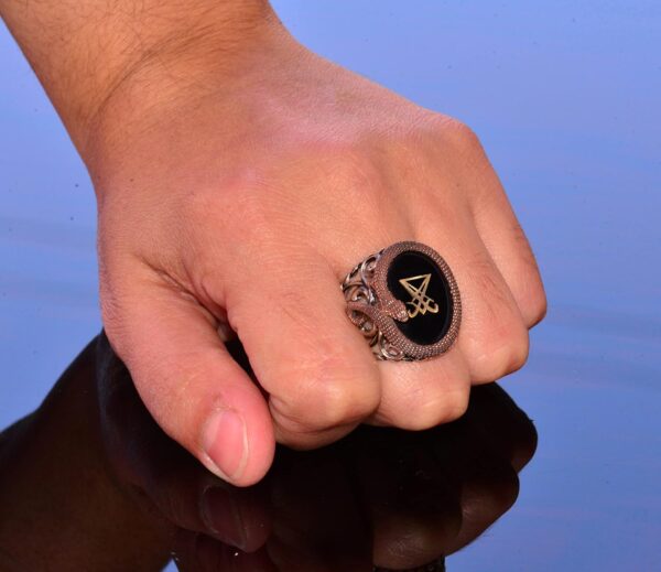 925 Ayar Gümüş Erkek Yüzük – Yapay Oniks Taşı – Yılan Tasarımı – İmza Yüzüğü (Lusifer)