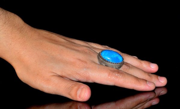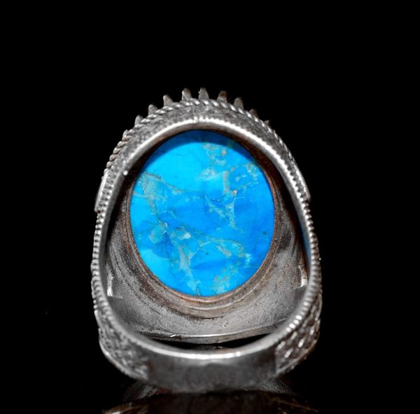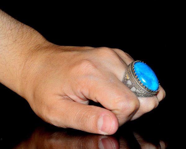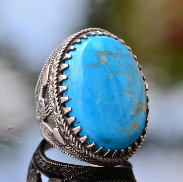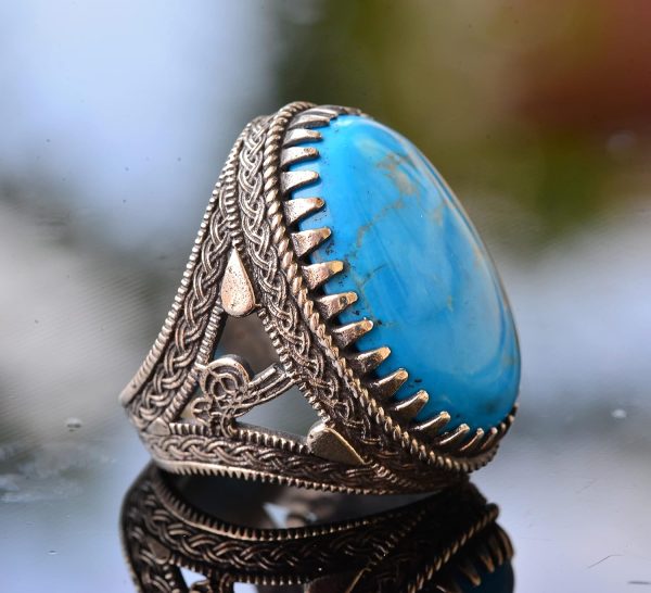 Yapay Turkuaz Taşlı Gümüş Erkek Yüzük – Bu zarif yüzükle stilinizi yükseltin. Yüksek kaliteli 925 ayar gümüşten üretilmiş ve canlı bir yapay turkuaz taşla tasarlanmıştır. Bu yüzük, Osmanlı takılarından ilham alarak, karmaşık işçilik ve kültürel anlamı sergilemektedir.