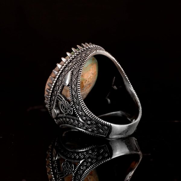 Bu muhteşem yüzük, 925 ayar gümüşün zamansız zarafetini doğal yeşil turkuazın canlı güzelliği ile birleştiriyor. Her parça titizlikle el yapımıdır, bu sayede benzersiz ve yüksek kaliteli bir tasarım ortaya çıkmaktadır.