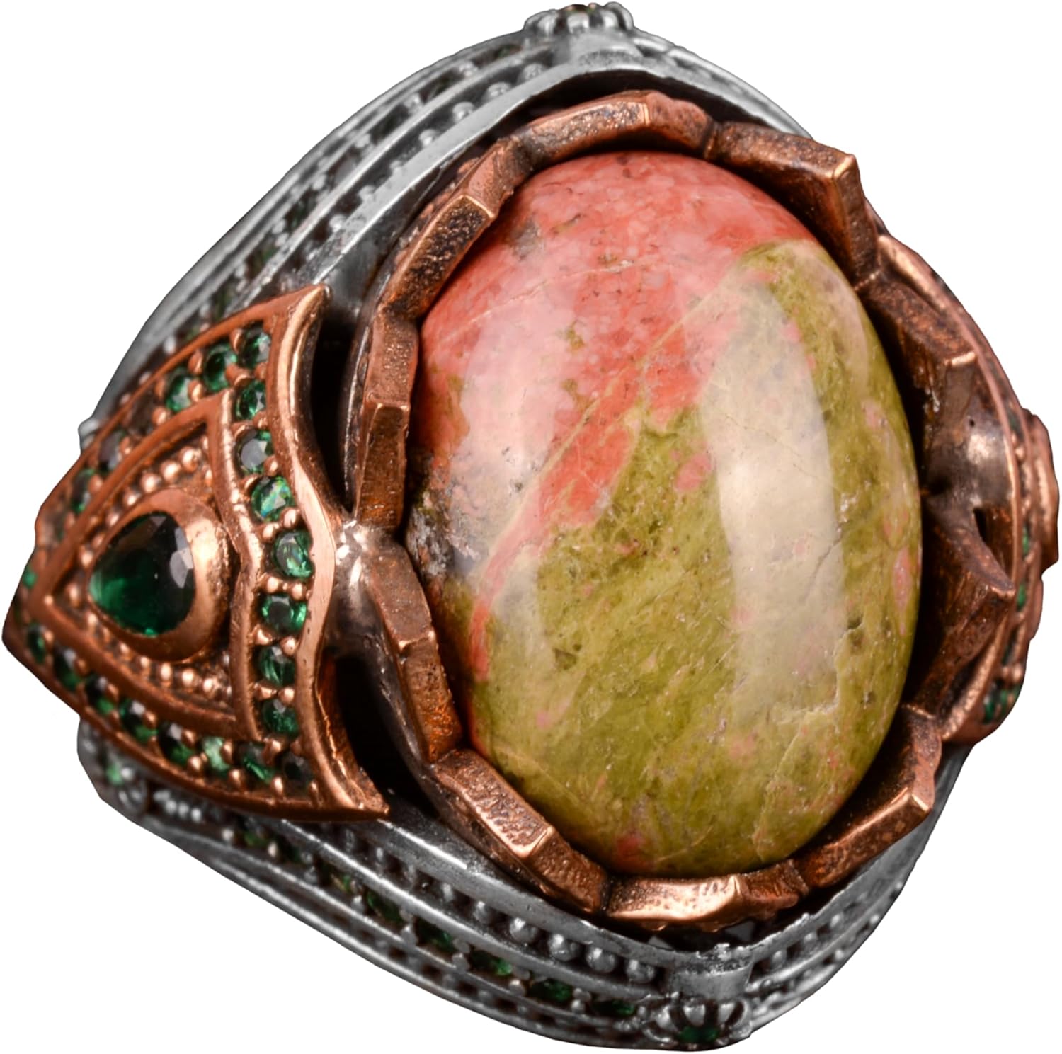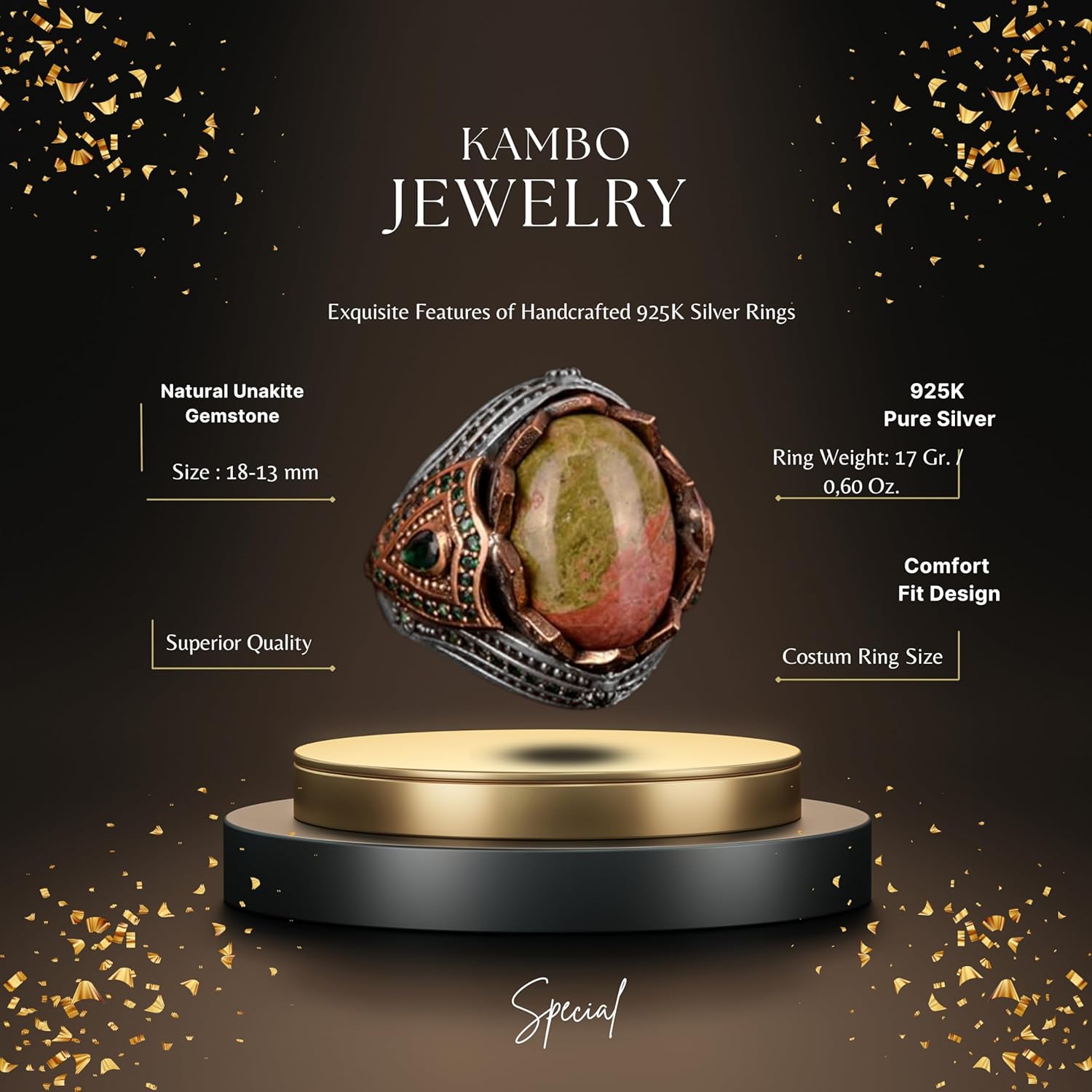 - Canlı rengi ve benzersiz desenleri ile bilinen doğal yeşil turkuaz taşı ile süslenmiştir.